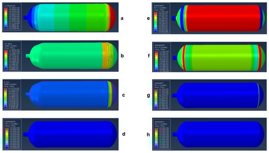 Response simulation using the conventional shell element model at failure for a stacking of 24 plies: (a) magnitude of the displacement, (b) yield response in the polymeric liner, (c) axial strain in the liner, (d) compression damage of the matrix in the first ply, (e) tensile damage of the matrix in the first ply, (f) damage of the matrix in tension at the third ply, (g) damage of the fiber in tension at the first ply, and (h) damage of the fiber in compression at the first ply.