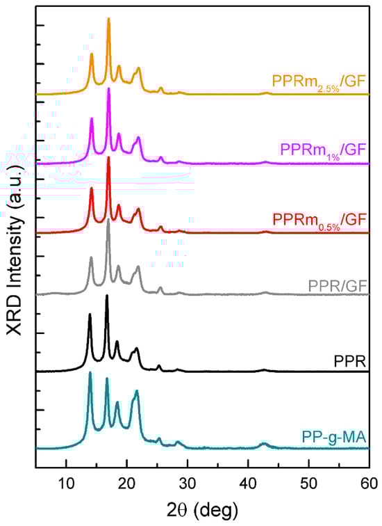 Crystalline structure characteristics of PPR, PP-g-MA and the PPRmx%/GF composites.