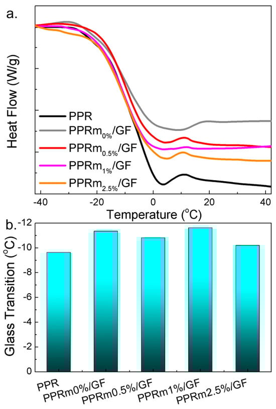 (a) DSC heat flow curves of neat PPR and the PPRmx%/GF composites focused on the temperature range close to the glass transition. (b) Glass transition temperature is calculated using the midpoint method. The measurements were performed in nitrogen flow of 60 mL/min using a heating rate of 20 °C/min.