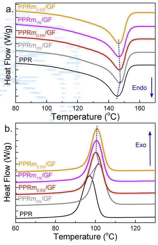 DSC (a) melting and (b) crystallization curves of the PPR and the PPRmx%/GF composites. The dotted lines are guides to indicate the shift of the DSC melting/crystallization peaks.