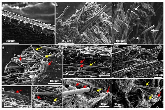 SEM images obtained for the fracture surface of (a) the neat PPR, (b,c) the PPRm0%/GF, (d) PPRm0.5%/GF, (e) PPRm1%/GF and (f) the PPRm2.5%/GF. Higher resolution SEM images of (g,h) the PPRm0.5%/GF, (i) the PPRm1%/GF and (j). White arrows—neat GF, red arrows—GF with adhered polymer matrix, yellow arrows—fibrillar matrix.