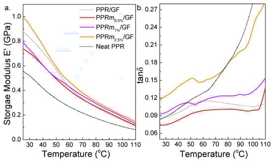 (a) Storage modulus E′ and (b) tanδ curves of neat PPR and the PPRmx%/GF composites as a function of temperature.