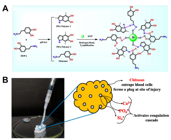 Application of silica-based nanomaterials in wound healing.(A) Possible interaction mechanism of polydopamine (DOPA) and silica nanoparticle (SiNP). Reproduced with permission from [196], Copyright 2018, Elsevier. (B) Schematic illustration of the possible action mechanism of bioglass-based hydrogel in blood. Reproduced with permission from [197], Copyright 2019, Elsevier.