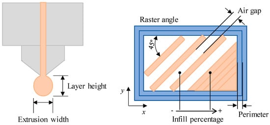 The material, structural elements, and manufacturing variables all affect the mechanical characteristics of MEX-printed parts. Among the manufacturing and structural characteristics are layer height, contour number, raster width, raster angle, infill percentage, fill pattern, air gap, build orientation, print speed, and extruder temperature. Component characteristics are influenced differently by various combinations and degrees of parameter variation (Figure 1) [,].
