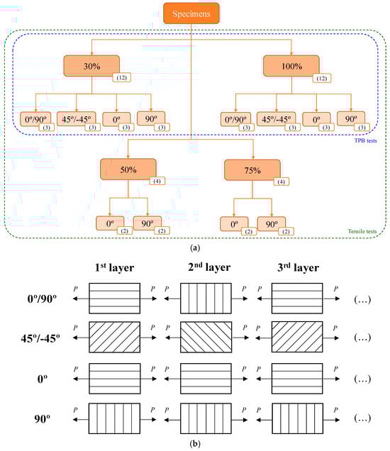 Specimens (a) infill percentage and filament orientations (data in parentheses represent specimen quantities); and (b) top-view of filament deposition (P represents the loading axis).