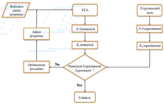 As previously stated, the goal of this work is to provide a simple strategy for identifying the elastic performance of PLA by combining experimental and numerical data through optimisation. Thus, the three-point bending (TPB) and tensile tests were selected as the two experimental tests. The chosen method entails identifying the printed PLA’s elastic characteristics that mimic the experimentally determined mechanical response (P-d curve) (Figure 4).