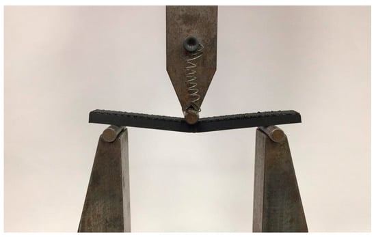 Bending tests were conducted according to the ISO 178 [] standard using servo-electrical material testing equipment (MicroTester INSTRON 5848, Instron®, Norwood, MA, USA) under displacement control (5.0 mm/min). An acquisition frequency of 5 Hz was selected, and a 2 kN load cell was used. At room temperature (25 °C, 65°RH), the displacement {δ) and load (P) were recorded, and the loading span (L) was 60 mm. Twenty-four specimens were tested (for 30 and 100% infill percentages) in the linear elastic region (Figure 5).