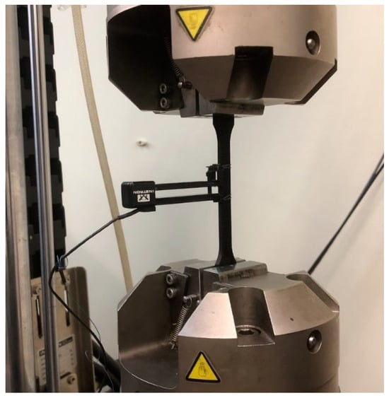 Tensile tests were accomplished at a displacement rate of 3 mm/min with a 25 kN load cell in an Instron® 8874 Universal Testing System. These tests were performed at room temperature (25 °C; 65°RH) following ISO 527-1 [] & ISO 527-2 [] standard directives. Using a gauge length of 25 mm, self-centering grips were implemented with a load-gripping distance L of 115 mm (Figure 2b). Tests were conducted on twenty-four specimens (Figure 6), with load (P) and displacement (d) being recorded at an acquisition frequency of 20 Hz.
