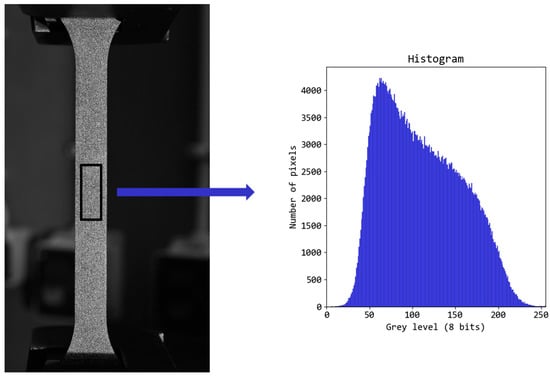 Typical speckle pattern for DIC measurements and corresponding grey level histogram.