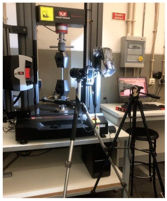 DIC measurements were employed at room temperature (25 °C; 65% RH) using an INSTRON® 5969 Universal Testing System equipped with a load cell of 5 kN and a displacement rate of 5 mm/min. The parameters that were established were load-gripping distance L (115 mm) and service length (80 mm) (Figure 2b). At the grips, the applied force P and displacement d were continuously measured at a 10 Hz acquisition rate. Since the strain field in the linear elastic domain must remain constant throughout the mechanical test, the central region of the specimen (located within in Figure 2b) is especially suited to measure elastic properties. This area was utilised specifically to create the speckle pattern due to the specimen surface being sufficiently flat and regular. To create a suitable carrier for DIC measurements, a fine matte coat was sprayed onto the specimen first, followed by an uneven spread of black marks (Figure 7). After this process, a distinct texture with the right isotropy and contrast could be defined due to the speckled pattern that was produced. In terms of the matching procedure, the reference image, or non-deformed configuration, is usually meshed into subsets designated as correlation domains, the size that determines the spatial resolution of the measurements. In this work, post-processing operations were carried out using the GOM Correlate 2018 software. The optical system was comprised of a TAMRON 24-70 MM F/2.8 lens (Saitama, Japan) and an 8-bit Nikon D800E camera (Tokyo, Japan) with a pixel resolution of 4912 × 7360 (Figure 8). The camera lens system was prudently placed in relation to the specimen surface, adopting a precision level, ensuring a working distance of 150 mm, which leads to a conversion factor of around 0.02 mm/pixel. By carefully opening the lens aperture (minimum depth of field), it was possible to focus and capture crisp photos of the speckled pattern. Still, to minimise diffraction effects (smallest apertures), the aperture was sealed throughout the loading procedure to produce a sufficient depth of field. By carefully controlling the shutter duration and illumination, motion blur and pixel saturation were prevented during movement. A specified 0.2 Hz was used for the picture capture rate, and 10–2 pixels (2 mm) was the displacement resolution achieved by setting the subset size and subset step to 15 × 15 pixels2 and 11 × 11 pixels2, respectively [].