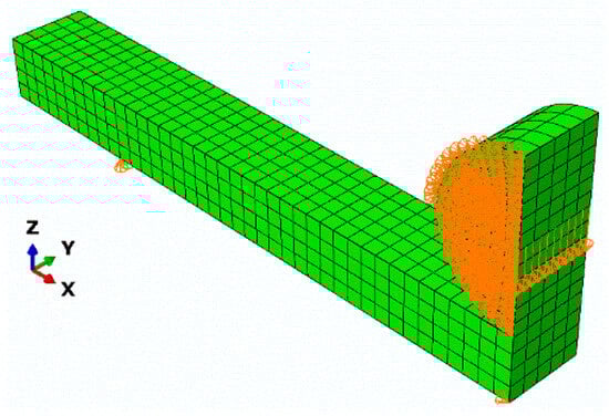 A numerical model was developed to mimic the three-point bending test, taking advantage of geometrical and material symmetry, counting the actuator (Figure 9). Non-linear geometrical analyses were accomplished usinga model composed of 1070 20-node quadratic brick elements with 5896 nodes.
