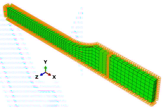 Dogbone geometry was also simplified to a quarter model trying to decrease the computational cost. The 672 20-node quadratic brick elements were defined, with a total of 4197 nodes. Boundary conditions were defined to adequately mimic the mechanical test (Figure 8), with a vertical displacement of 5.0 mm (Figure 10). The orthotropic behaviour of PLA structures was mimicked using the same elastic properties as the TPB model.