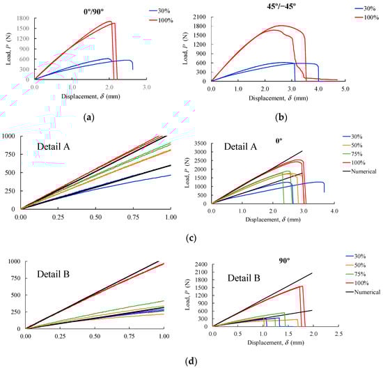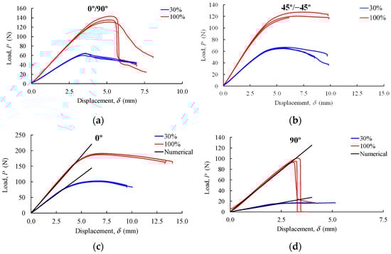 Experimental and numerical P-d curves for the orientations: (a) 0°/90°, (b) 45°/−45°, (c) 0°, and (d) 90° obtained in TPB tests.