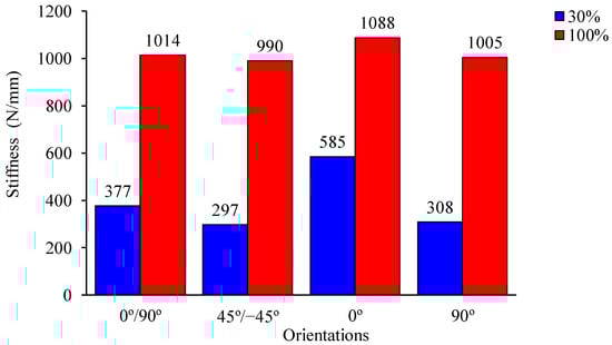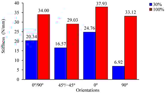 Load–displacement curves (Figure 11) showed an impressive degree of consistency for each processing condition (infill and orientation), both in terms of initial stiffness () and ultimate load. This is the result of meticulous specimen preparation (implementing the same PLA coil), as well as extremely optimal conditions during the filament-making operation and the experimental work. Variances in the initial stiffness and ultimate load are perceived between processing conditions (0°/90°, 45°/−45°, 0°, and 90°, for 30% and 100% infill). Figure 11 and Figure 12 show the impact of infill percentage and filament orientation on the initial stiffness along the specimen longitudinal direction. The stiffness resulting from 100% infill is greater than that obtained for 30% infill, regardless of the orientation of the filament. The stiffness is found to reach its maximum value for the 0° orientation at 30% infill, and then to reach its lowest value for 90°, 45°/−45°, and the stacking sequence 0°/90°. This indicates that, if the infill percentage is set to 30%, an increase in stiffness of 258% is achieved when the filament is aligned with the load (0°) compared to the orientation 90°. With respect to the 100% infill, the referred order hardly varies for 90° and 45°/−45° orientations. For the orientation 90° and 100% infill, this variation can be explained by the presence of a more extensive and pronounced filament fusion, which is not confirmed for the 30% infill.