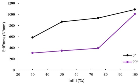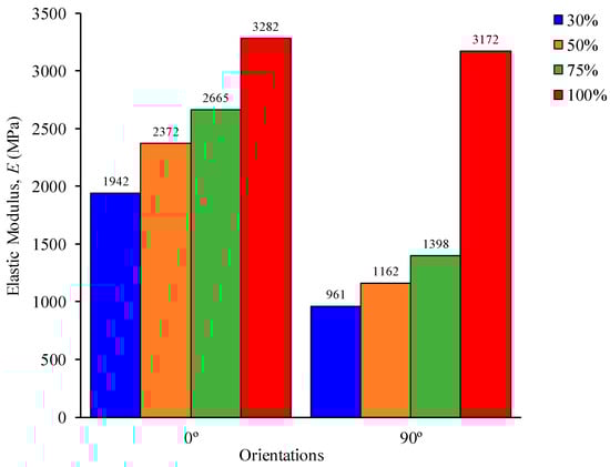 The elastic modulus was determined for filament aligned at 0° and 90° (Figure 19) thus enabling more precise analysis of the impact of the infill percentages (i.e., 50% and 75% infill, in addition to 30% and 100%), leading to and , respectively.