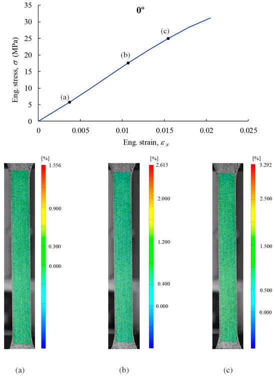 Using the DIC technique, full-field measurements of strain were carried out in both the x and y directions in the specimen’s central region (Figure 2b), displaying uniform measurements in the linear–elastic domain. The strain field in the x-direction obtained in the linear–elastic domain at three loading points on the stress–strain curve’s ascending branch is displayed in Figure 16.