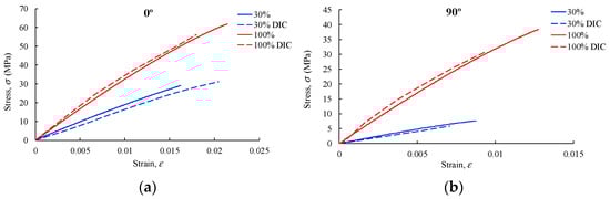 Stress–strain curves for the orientations: (a) 0° and (b) 90° obtained in standard tensile tests and with DIC.