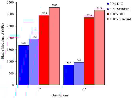 The elastic modulus (E) was then obtained for filament orientated at 0° and 90° (Figure 17). One can notice that the obtained value of E is slightly higher in tests using a strain gauge (standard tests) compared to those carried out with DIC (13% on average). However, the latter technique yields more information (full-field measurements) than the former, based on measurements conducted in two specimen sections (gauge fittings).