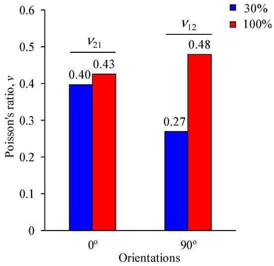 Poisson’s ratio values (nyx = −ey/ex) were measured for filaments oriented at 0° and 90° (n21 and n12, respectively), with 30% and 100% infill (Figure 20), i.e., structures evaluated with DIC. The result, that the Poisson’s ratio is lower in 30% infill than in 100% infill, is consistent with a more compliant structure when the number of filaments per unit volume is lower along the transverse direction (y-direction in Figure 2b). Figure 20 indicates that the orientation at 90° and 100% infill yielded the highest Poisson’s ratio value. This may be justified by the structure’s greater sensitivity to longitudinal loads resulting in transversal deformation for a considerable condensed material, i.e., 100% infill. Since less-compact structures (30% infill) exhibit more air gaps, such behaviour is not observed.