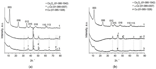 XRD patterns of the samples with Co/Cu = 1 (a) and Co/Cu = 2 (b): 1—as-synthesized CoCuMgAl-LHs; 2—CoCuMgAlOx-R; 3—CoCuMgAlOx-R after FAL hydrogenation.