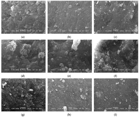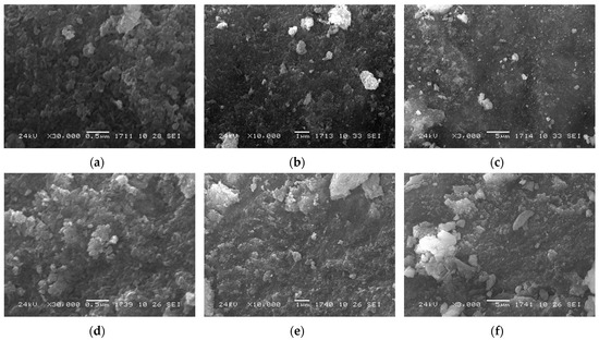 The surface morphology of the samples was investigated using scanning electron microscopy (SEM) conducted via a JSM-6460 LV instrument (JEOL Ltd., Tokyo, Japan) with a tungsten cathode and an accelerating voltage of 19 and 24 kV. Each catalyst sample was ground in an agate mortar and fixed on a conducting double-sided carbon Scotch tape. To prevent re-charging effects, a conducting gold film was sputtered on the fixed samples. Prior to each measurement, the samples were evacuated in the microscope chamber for 15–20 min to remove volatile compounds from the surface, as these could exert a detrimental effect on the secondary electron emission and thus deteriorate quality of the image.