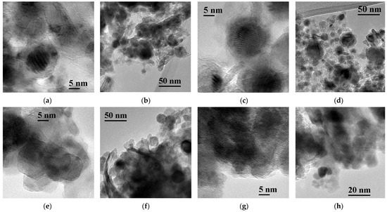 Since the CoCuMgAl-oxide catalysts possessed good activity regarding FAL hydrogenation, changes in their microstructure during the reaction were of particular interest. TEM images of the fresh CoCuMgAlOx-R catalysts with Co/Cu = 1 and 2, as well as the images of these samples after FAL hydrogenation (90 °C, 20 bar), can be seen in Figure 4. In accordance with the obtained data, clear agglomerates of metallic particles can be observed in all the fresh catalysts irrespective of their Co/Cu ratios (Figure 4a–d). These agglomerates have a “core–shell” structure. According to EDX spectroscopy, the metallic Co and Cu particles are in the “core”. The average diameter of the “core” is 12.7 nm. Lattice fringes, which are difficult to attribute to a specific oxide phase, can be identified in the “shell”. It is most likely that different types of non-stoichiometric CoCuMgAlOx mixed oxides can exist simultaneously. The XRD data obtained for these samples also confirm this assumption (Figure 1, patterns 2). Such a phenomenon is often observed for catalysts prepared via the high-temperature treatment of LHs [25]. The high selectivity toward FOL achieved by the CoCuMgAlOx-R catalysts may be due to their microstructures. The catalytically active metallic Co and Cu species located in the “core” have limited accessibility to reacting molecules. As a result, the reactions of deeper hydrogenation are suppressed, even under harsh reaction conditions.