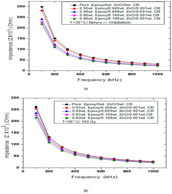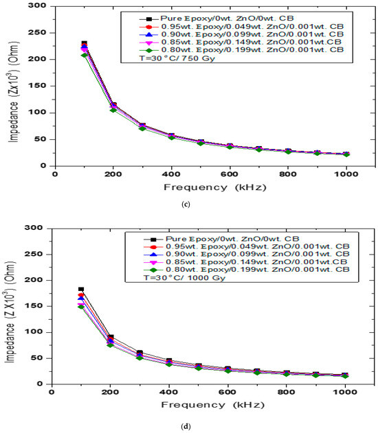 As shown in Figure 1b, for pure epoxy, the impedance values of the γ-irradiated hybrid nanocomposites at 100 Gy are relatively less than the non-irradiated nanocomposites and dropped from 2.98 × 105 − 0.306 × 105 (Ohm) to 2.62 × 105 − 0.268 × 105 (Ohm). At 750 Gy, as shown in Figure 1c, it dropped to 2.31 × 105 (Ohm) at 100 kHz and to 0.236 × 105 (Ohm) at 1000 kHz. In Figure 1d, at 1000 Gy and T = 30 °C, it dropped to 1.83 × 105 (Ohm) at 100 kHz to 0.187 × 105 (Ohm) at 1000 kHz, and the extra information found in Table 1 is in the same frequency range from 100–1000 kHz.