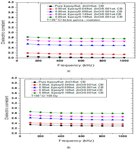 Figure 2a–d represent the dielectric constant behavior as a function of frequency before and after γ irradiation at different doses = 100, 750, and 1000 Gy for the epoxy/ZnO/CB hybrid polymer nanocomposites. The dielectric constant values of the tested nanocomposites before being γ-irradiated are shown in Figure 2a. In this figure, the aging effect on the dielectric constant values reveals that the dielectric constant values that are tested in 2024 are less than the values registered in 2015 [31]. The dielectric constant values for pure epoxy dropped from 3.8–3.77 to 2.065–2.010 when measured at room temperature and within the same frequency range (100–1000 kHz). Similarly, this drop in values as a function of time happens to all samples. The effect of the gamma-irradiation doses on the dielectric constant of the tested hybrid nanocomposites is described in Figure 2b–d. As shown in Figure 2b for the pure epoxy, the dielectric constant values of the γ-irradiated hybrid nanocomposites at 100 Gy are relatively greater than the non-irradiated nanocomposites, increased from 2.065–2.010 to 2.354–2.299. At 750 Gy, it increased to 2.670 –2.608, as shown in Figure 2c. Finally, at 1000 Gy and in the same frequency range (100–1000 kHz), the values increased to 2.717–2.640, as shown in Figure 2d.