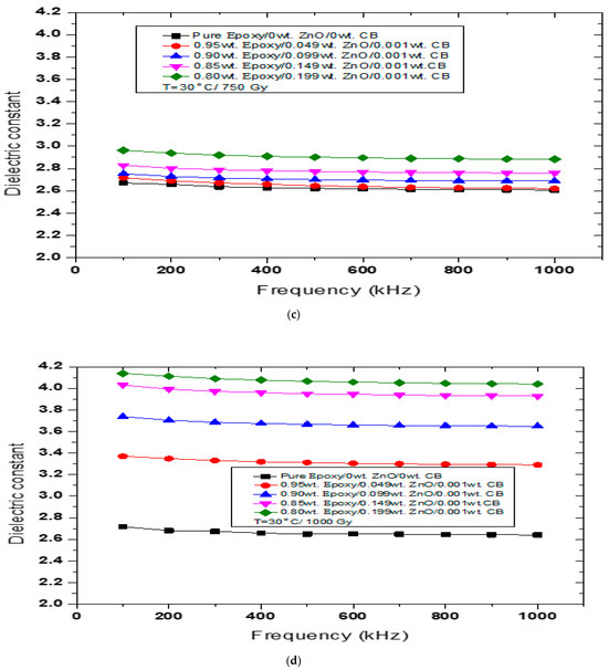 The variation in the real part of permittivity (dielectric constant) with respect to frequency for the composites at a temperature of 30 °C. CB: carbon black; ZnO: zinc oxide. (a): Before γ irradiation, (b) at 100 Gy, (c) at 750 Gy, and (d) at 1000 Gy.