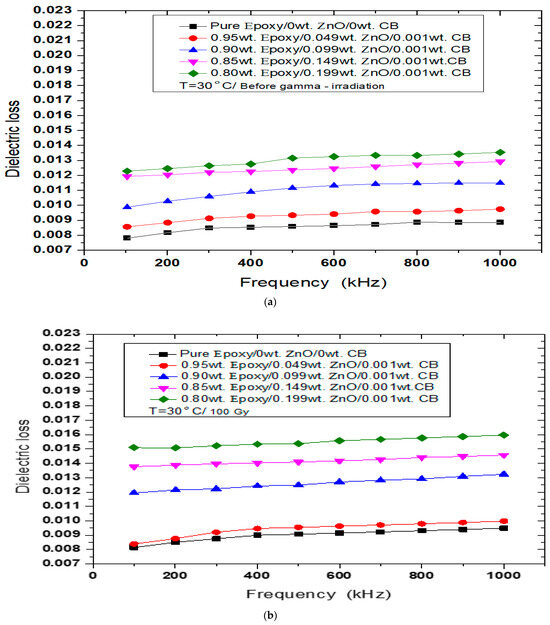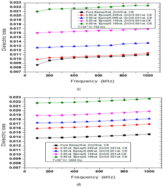 Figure 3a–d represent the dielectric loss as a function of frequency before and after γ irradiation at different doses = 100, 750, and 1000 Gy for the epoxy/ZnO/CB hybrid polymer nanocomposites. The dielectric loss values of the tested nanocomposites before γ irradiation at room temperature are shown in Figure 3a. From this figure, we noticed that the values of dielectric loss linearly increased as the frequency increased. For pure epoxy, the dielectric loss at room temperature before the γ irradiation increased from 0.007 up to 0.009 in the range of 100 kHz to 1000 kHz, respectively. After the γ irradiation of 100, 750, and 1000 Gy of dosages, the values changed from 0.008 to 0.095 (Figure 3b), 0.0086 to 0.011 (Figure 3c), and 0.013 to 0.016 (Figure 3d), respectively, during the same frequency range as mentioned above at room temperature.