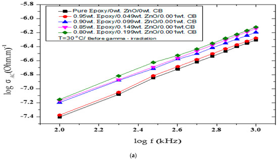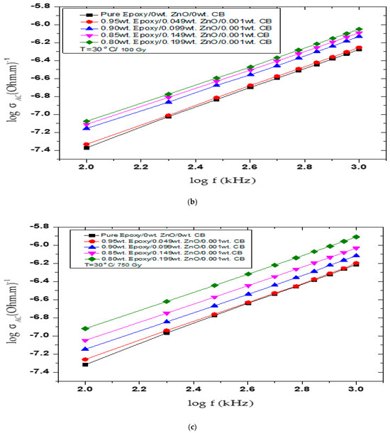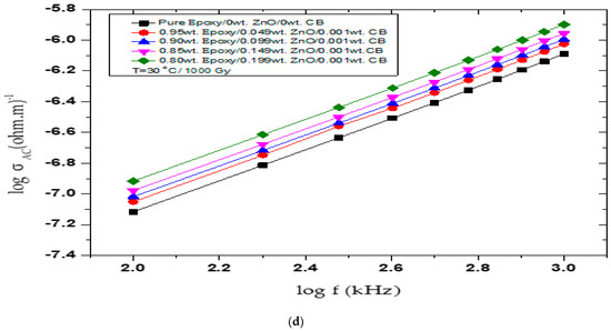 Figure 4a–d exhibit AC-electrical conductivity log(σ) vs. frequency log(f) before and after γ irradiation at different doses for the epoxy/ZnO/ CB hybrid polymer nanocomposites. The AC-electrical conductivity values of the tested nanocomposites before being γ-irradiated are shown in Figure 4a. In this figure, the aging effects on the AC-electrical conductivity values are shown as measured values compared to those previously published [31]. For example, the AC-electrical conductivity values for pure epoxy were given as 0.49 × 10−6 − 4.6 × 10−6 (Ohm. m)−1 and decreased to 0.041 × 10−6 − 0.500 × 10−6 (Ohm. m)−1. Hence, the AC-electrical conductivity decreased as a function of time for all samples. The effect of the γ-irradiation doses on the AC-electrical conductivity of the tested hybrid nanocomposites is described in Figure 4b–d. As shown in Figure 4b for the pure epoxy, the AC-electrical conductivity values of the γ-irradiated hybrid nanocomposites at 100 Gy are relatively greater than the non-irradiated nanocomposites and increased from 0.041 × 10−6 at 100 kHz and 0.5 × 10−6 at 1000 kHz (Ohm. m)−1 to 0.042 × 10−6 at 100 kHz and 0.530 × 10−6 at 1000 kHz (Ohm. m)−1; at 750 Gy (Figure 4c), it increased to 0.048 × 10−6 and 0.611 × 10−6 (Ohm. m)−1 and, as shown in Figure 4d at 1000 Gy, the values increased to 0.077 × 10−6 and 0.810 × 10−6 (Ohm. m)−1.