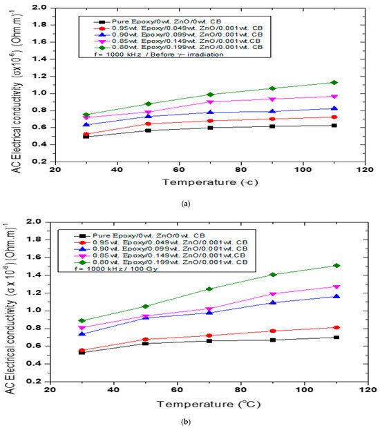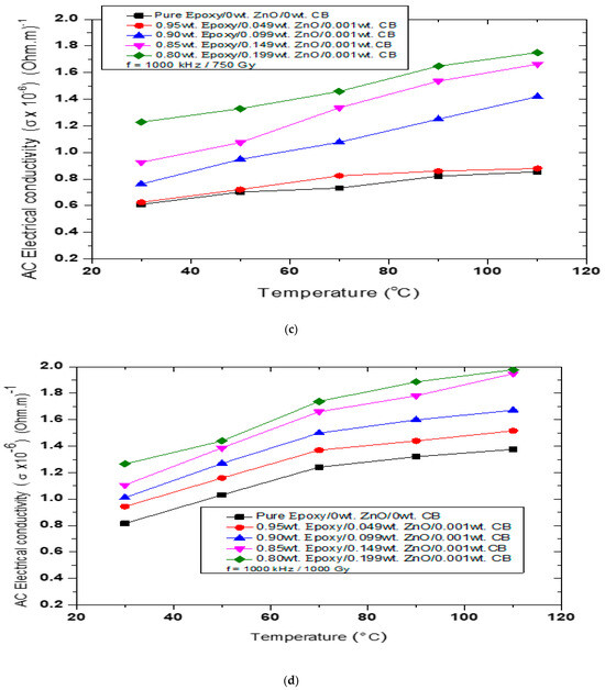 The AC-electrical conductivity for different nanocomposites as a function of temperature is represented in Figure 5a–d at a fixed frequency (1000 kHz) before and after γ irradiation, as in Table 4, Table 5, Table 6 and Table 7. Figure 5a represents the measurement of AC-electrical conductivity before γ irradiation at a frequency of 1000 kHz, in which AC-electrical conductivity increased as the temperature increased and the concentration of ZnO nanoparticles increased (0, 4.9, 9.9, 14.9, and 19.9 by weight %). For the pure epoxy, the AC-electrical conductivity before γ irradiation increased from 0.5 × 10−6 to 0.63 × 10−6 (Figure 5a). At 100 Gy, as shown in Figure 5b, the values increased from 0.53 × 10−6 to 0.7 × 10−6. At 750 Gy (Figure 5c), the values increased from 0.61 × 10−6 to 0.86 × 10−6. And finally, at 1000 Gy (Figure 5d), the values jumped from 0.81 × 10−6 to 1.4 × 10−6 at the same temperature, T = 30 °C and T = 110 °C, respectively, and at 1000 kHz. When the nanocomposites are irradiated by γ rays, the radiation causes chain scissions in the nanocomposites. This created defects, free radicals and/or electron densities, which can be trapped within the bulk of the nanocomposite material. Thus, the irradiated nanocomposites’ conductivity confirmed enhanced behavior in comparison to those of the non-irradiated ones. Also, it is rationally assumed that any increase in AC conductivity based on the increase in irradiation dosage can be attributed to the polymer chains’ degradation of the nanocomposites [22,35,36].