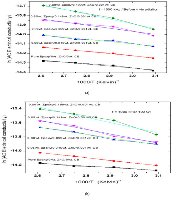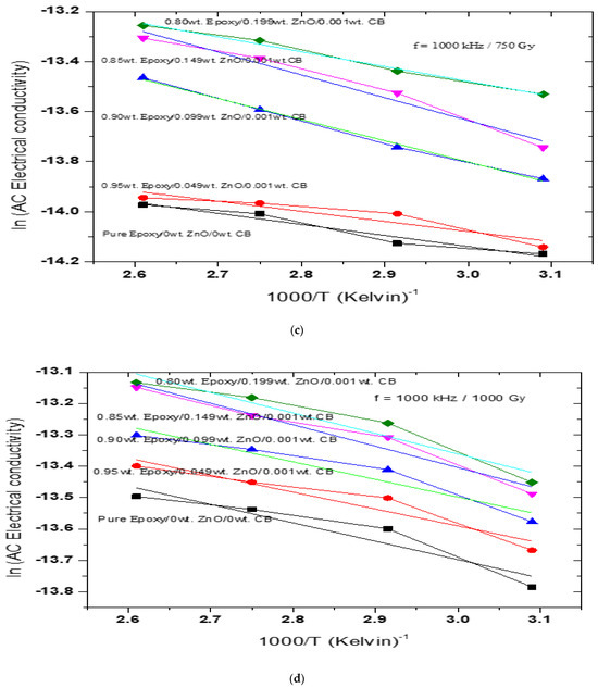 The variation in the AC-conductivity as an Arrhenius function of temperature at 1000 kHz. CB: carbon black; ZnO: zinc oxide. (a) Before γ irradiation, (b) at 100 Gy, (c) at 750 Gy, and (d) at 1000 Gy.