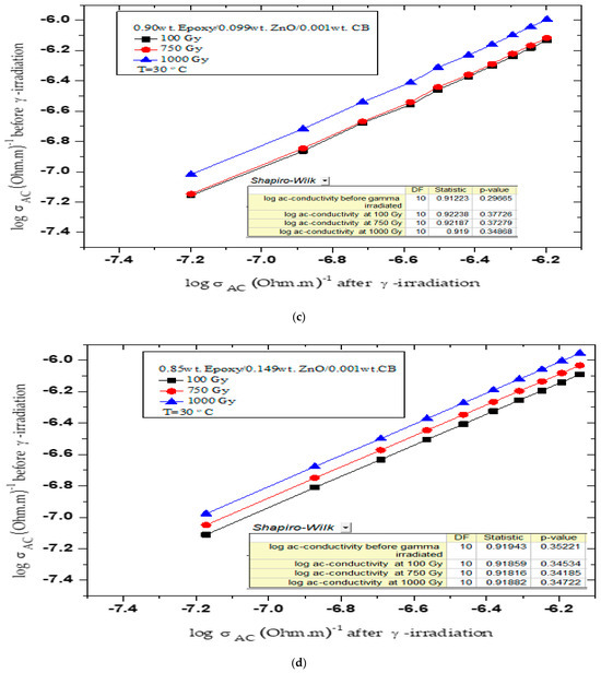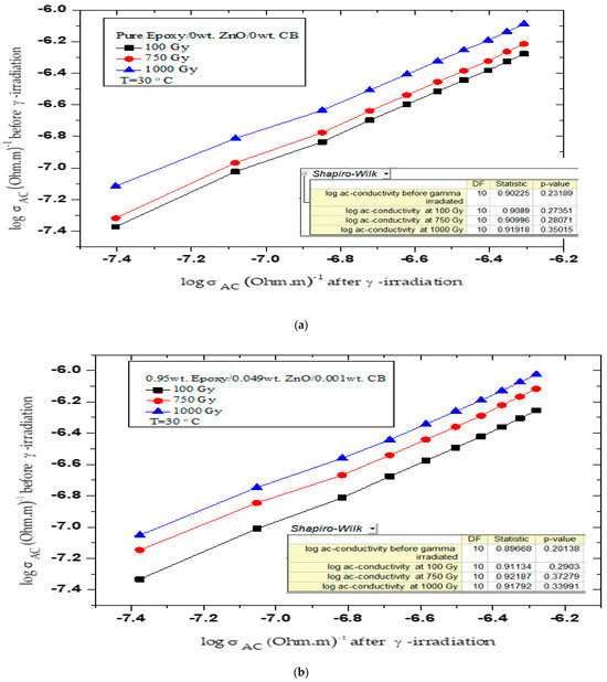 Shapiro’s examination procedures were carried out for the results obtained for the variables AC-conductivity log (σ) before γ irradiation vs. AC-conductivity log (σ) after γ irradiation for the epoxy nanocomposites at a temperature of 30 °C, where the (p) values and the (W) values were obtained. The test showed that the (p) values for all samples before and after γ irradiation were greater than 0.05, as shown in Figure 7a–e, which means the normality cannot be rejected.