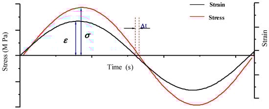By virtue of the matrix material, polymer composites exhibit viscoelastic behaviour. In response to the mechanical loading, it exhibits the attributes of an elastic solid at some instances and a viscous fluid at other instances. In general, its characteristics are intermediate between the ideal solid governed by Hooke’s law and ideal liquid behaviour described by Newton’s law of viscosity. In most cases, the properties of viscoelastic materials are characterised by harmonic behaviour with respect to time. Assuming that the behaviour of the composite under consideration is linear, the strain is harmonic (Equation (2)), and the stress is also harmonic with an angular velocity of ω. A phase difference exists between the given phase difference (δ = ωΔt) with respect to the strain (Figure 1).