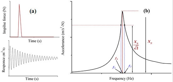 The frequency response would be in terms of receptance or accelerance, which ultimately depends on the sensor used to acquire the response. From these plots, natural frequency (fn) would be obtained corresponding to peak amplitude. The damping ratio (loss factor) is estimated according to the half-power bandwidth method (Figure 2b). The expression for calculating the loss factor from the half-power bandwidth method is given by