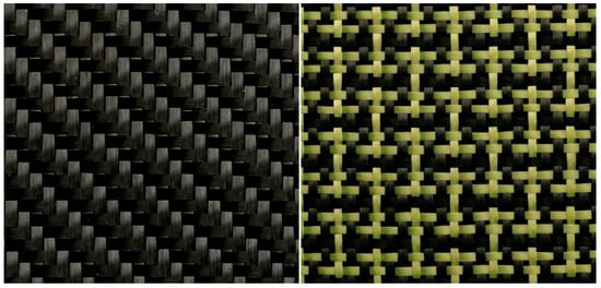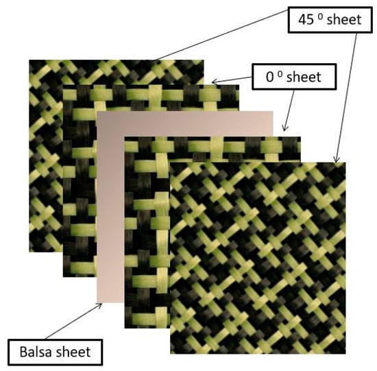 Carbon fibre (210 gsm 2×2 Twill 3k Carbon Fibre Cloth) and carbon–Kevlar (188 gsm Plain Weave 3k Carbon Kevlar Cloth) procured from Easy Composites Ltd., Stoke-on-Trent, UK were used for the laminate preparation. Balsa wood (2 mm thick) sourced from Udupi was used for the sandwich material. The photographs of the fibre cloth are shown in Figure 3. Four configurations of laminates were prepared by employing both fibre sheets by varying the angle of the fibre in steps of 0°, 15°, 30°, and 45°. Fibre sheets with dimensions of 300 mm × 300 mm were cut as per the orientations [0/0/Balsa/0/0], [15/0/Balsa/0/15], [30/0/Balsa/0/30], and [45/0/Balsa/0/45], respectively.