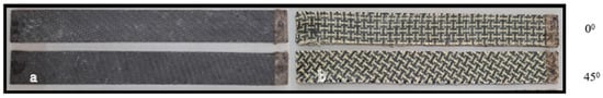Test samples: (a) carbon fibre 0° and 45°, (b) carbon–Kevlar 0° and 45°.