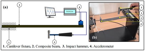 The dynamic response of the composite beam was evaluated from impact-hammer-based experimental modal analysis [18,19,20]. These measurements are in compliance with the ASTM E756–05 standard [30]. The specimens were measured to be 230 mm × 30 mm. The schematic of the experimental set up is illustrated in Figure 6. An impact hammer (PCB, type-086C40) of sensitivity 2.25 mV/N was employed to give the input excitation near the fixed end of the beam. The response signals were measured from an accelerometer (PCB, sensitivity of 101.6 mV/g) attached at the free end of the beam. The impulse force and the acceleration signals were acquired from the NI-9234 data-acquisition module through NI-LabVIEW graphical programming.