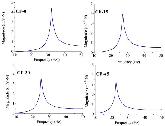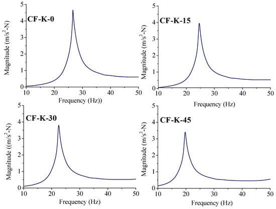 The frequency response plots obtained from the impact hammer test are presented in Figure 7 and Figure 8. As evident from the accelerance vs. frequency plots, the dynamic response was distinctly different for the CF composite and the CF-K composite beams. For CF beams with a fibre orientation of 0 degrees, the natural frequency was observed at 26.5 Hz. The corresponding value for the orientation of 45 degrees was 19.5 Hz. This indicates that natural frequency is a function of the orientation of the fibres. For CF-K beams, similar trends were noticed, with the natural frequency decreasing from 32 Hz to 22.5 Hz, as the fibre orientation was varied from 0 degrees to 45 degrees, respectively. These plots confirm the fact that the hybridisation has a positive impact on the resonance frequency of the composite beams. For the CF-K beam, for 0-degree fibre orientation, the natural frequency increased from 26.5 Hz to 32 Hz as the fibre type was modified. In other words, the hybridisation of the fibres improves the overall stiffness of the structure, which improves the rigidity and load-bearing capacity of the structure.