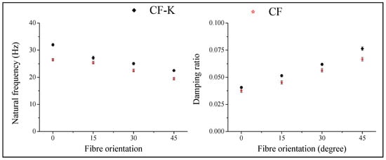 The natural frequency of the samples reduced as the angle of orientation was increased, and the 0° sample showed the highest and the 45° sample showed the lowest natural frequency. This trend was consistent for both CF- and CF-K-reinforced samples. It was also observed that the natural frequency of CF-K intra-ply samples was higher than that of the CF specimen, indicating the enhancement in the stiffness by inclusion of the hybrid fibre.