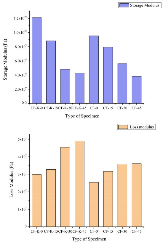 The storage and loss modulus of composites estimated according to Equations (5) and (8) are presented in Figure 10. Among the CF composites, the maximum value of the storage modulus is registered for the fibres oriented at 0 degrees and the least for the composites prepared with a fibre orientation of 45 degrees. However, the trend is reversed as with respect to the variation in loss modulus with respect to the fibre orientation. This indicates that, for the same level of matrix loading, the energy dissipation characteristics can be varied by varying the orientation of the fibre. However, a compromise should be made with respect to the ability to store the energy.