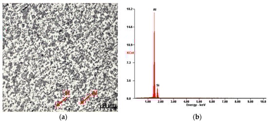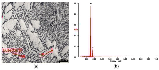 The optical microstructure of the AC1 alloy is shown in Figure 2a. It consists of eutectic Si needles dispersed randomly throughout the α-Al matrix. The EDX (energy dispersive X-ray) spectrum of the AC1 alloy is shown in Figure 2b. The Al and Si peaks in the spectrum are particularly prominent. As shown in Figure 3a, the SF1 alloy microstructure was composed of evenly dispersed, fine eutectic Si particulates. The EDX spectrum of the SF1 alloy is shown in Figure 3b. Additionally, it was found that the matrix of the SF1 alloy included a 7 vol.% of micron-sized porosity and showed an improved solid solubility of Si. The high fraction of liquid in the spray causes the entrapment of gas in the liquid, which results in the formation of pores in the alloy [26]. However, the amount of porosity was not significantly influenced by the presence of Cu and Si.