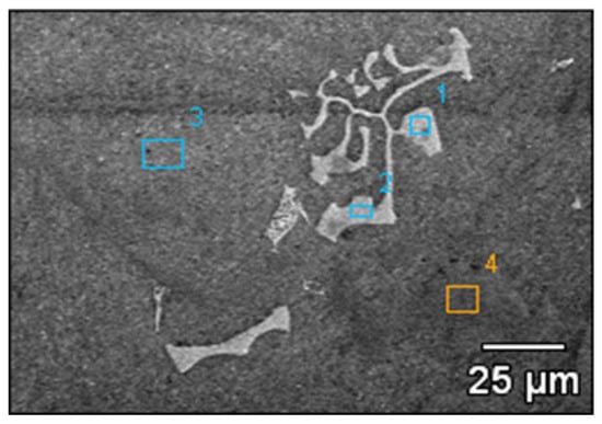 The SEM micrograph of the AC2 alloy is shown in Figure 4. The micrograph depicts the random distribution of the eutectic Si phase, the θ-Al2Cu phase, and the Q-Al-Si-Cu phase in the dendritic α-Al matrix. At the grain boundaries of the Al dendrite arms, the intermetallic θ and Q phases were found to be coarse, ranging in size from 50 to 75 μm. Table 4 displays the composition of the AC2 alloy, as determined by EDX analysis at spots 1, 2, 3 and 4 as shown on the microstructure.