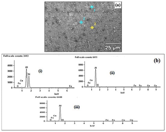 Figure 5a depicts the SEM microstructure of the SF2 alloy. The microstructure of the alloy showed fine precipitates of θ-Al2Cu and Q-phases in an equiaxed Al matrix, as well as a uniform, homogeneous distribution of fine eutectic Si particles, with sizes ranging from 3 to 7 μm. The EDS spectra of spots 1, 2 and 3 of Figure 5a are shown in Figure 5b(i,ii,iii) respectively. The EDX analysis of the SF2 alloy has revealed fine eutectic Si, fine precipitates of θ-Al2Cu, and Q-Al74Si9Cu10 phases.