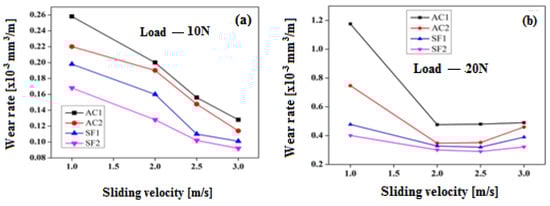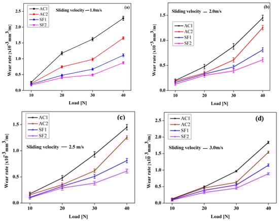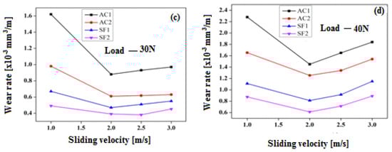 The variation in the wear rate of the AC and SF alloys as a function of load and sliding velocity (a) 1.0 ms−1; (b) 2.0 ms−1; (c) 2.5 ms−1; and (d) 3.0 ms−1.