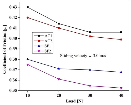 In Figure 8, the relationship between the coefficient of friction (µ) and the applied load at a sliding velocity of 3.0 ms−1 is presented. It was observed that the µ remained almost steady, with a slight decrease over time as the load increased. The results indicate that regardless of the composition, the SF alloys had a lower µ than did the AC alloys. The SF2 alloy in particular had the lowest µ. At a load of 10 N, the SF1 and SF2 alloys exhibited 7% and 4% less µ, respectively, compared to the AC alloys. At a high load of 40 N, the µ of the SF1 and SF2 alloys was 9% and 6% less than that of the AC1 andAC2 alloys, respectively. When the load is low, there is no metal-to-metal contact between the pin and counter surface. Instead, the behavior is influenced by the oxidation process and the adhesion of small protrusions on the contacting surfaces. As the load increases, the µ decreases slightly, which may occur because of metallic contact between the counter face and the pin. This contact leaves no room for imperfections and locks the surface contact area. The slight variation in the µ at higher loads may be attributed to the fact that all alloys contain more aluminum than the alloying elements. At higher loads, the aluminum matrix in the specimens and the counter face come in contact with each other, which determines the effective coefficient of friction.