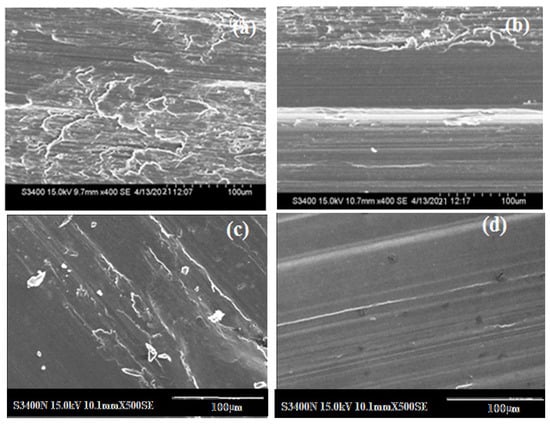 The worn surfaces of AC and SF alloys at a 40 N load and a sliding velocity of 3.0 ms−1 are as shown in Figure 9. The topography of the worn surfaces indicates that the binary alloys have suffered more damage than the ternary alloys. The worn surface of the AC1 alloy showed several features, including oriented overlapping flaky structures, wear scars, craters, the crass plastic flow of metal, metallic fracture of the ridges, and edge cracking (Figure 9a). The damaged surface also revealed evident signs of plastic deformation, along with adhesive wear. On the other hand, the AC2 alloy, as shown in Figure 9b, shows wide parallel grooves, compacted oxide patches, and a few discontinuous abrasive grooves on its worn surface. During the wear testing, the sliding of a soft pin surface against a hard disc caused two types of abrasive wear. The first type occurred when the pin penetrated the disc and created continuous parallel grooves. The second type occurred when hard intermetallic phases, such as Si and Al2Cu, were introduced between the sliding surfaces. This type of wear caused the formation of surface cavities due to debris detachment, which indicated delimitative wear on the surface layers. As a result, cracks were formed below the surface layers and grew until they joined together, forming plate-shaped particles that detached from the wear surface. In Figure 9c, it is observed that the worn surface of the SF1 alloy displayed a homogenous wear pattern. The surface was smooth, with fine abrasion grooves, a few small dimples, and some scoring marks that extended from end to end. Additionally, the surface showed white patches, indicating the early stages of oxide formation. On the other hand, in Figure 9d, we can see the worn surface of the SF2 alloy, which had small, homogeneous, and continuous grooves. The surface was smooth, with fine scoring marks, and it had no pits or dimples, indicating a low wear-rate [24].