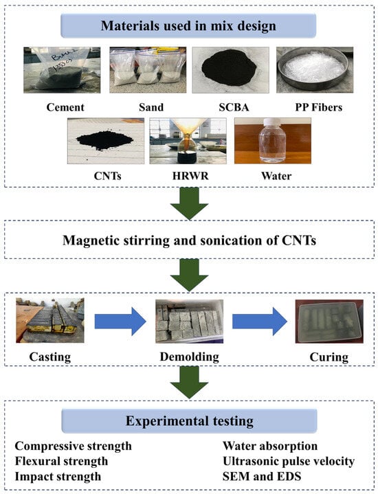 The methodology opted for this study involved material processing, mix design, batching of materials, stirring and sonication of CNTs, casting, curing, and finally, experimentation. The experimental methodology adopted in this research is summarized in Figure 1.