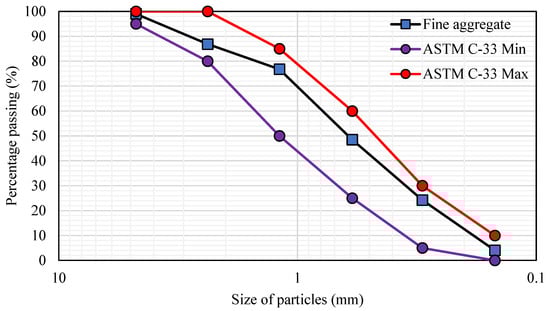Natural river sand was utilized as fine aggregate. The specific gravity and water absorption of sand, as determined following ASTM C128 [], were found to be 2.69 and 1.07%, respectively. The particle size distribution of fine aggregate is displayed in Figure 2. It can be seen that the particle gradation for sand was within the limits specified by ASTM C33 [].